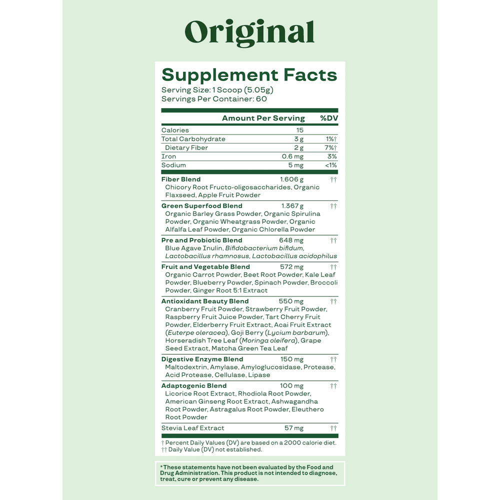 Disfruta de una salud óptima con 38 ingredientes naturales que ayudan a aliviar la hinchazón, mejorar tu digestión y darte energía, ¡todo en un delicioso sabor.