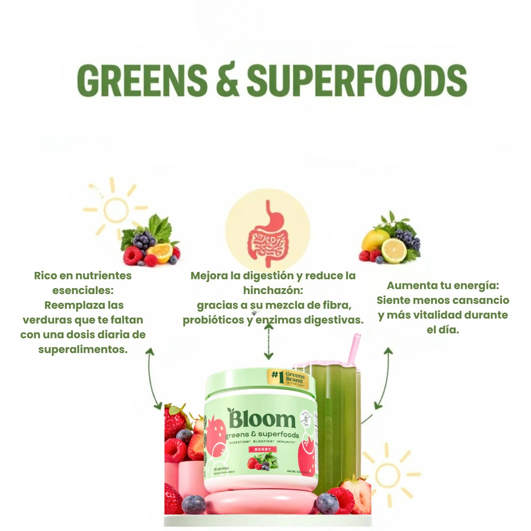 Bloom Greens & Superfoods es un suplemento fácil y delicioso, con 38 ingredientes naturales que proporcionan las vitaminas, minerales y antioxidantes que tu cuerpo necesita.