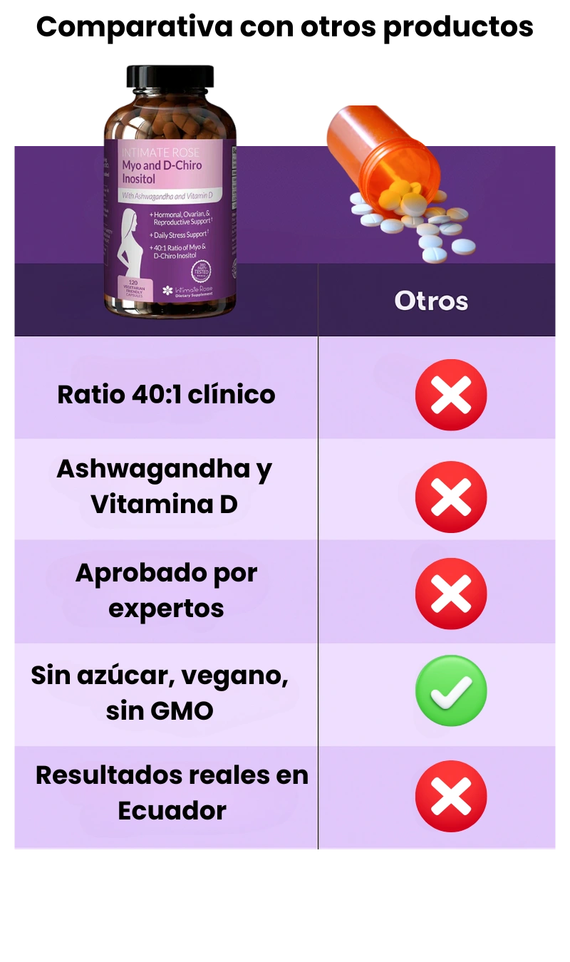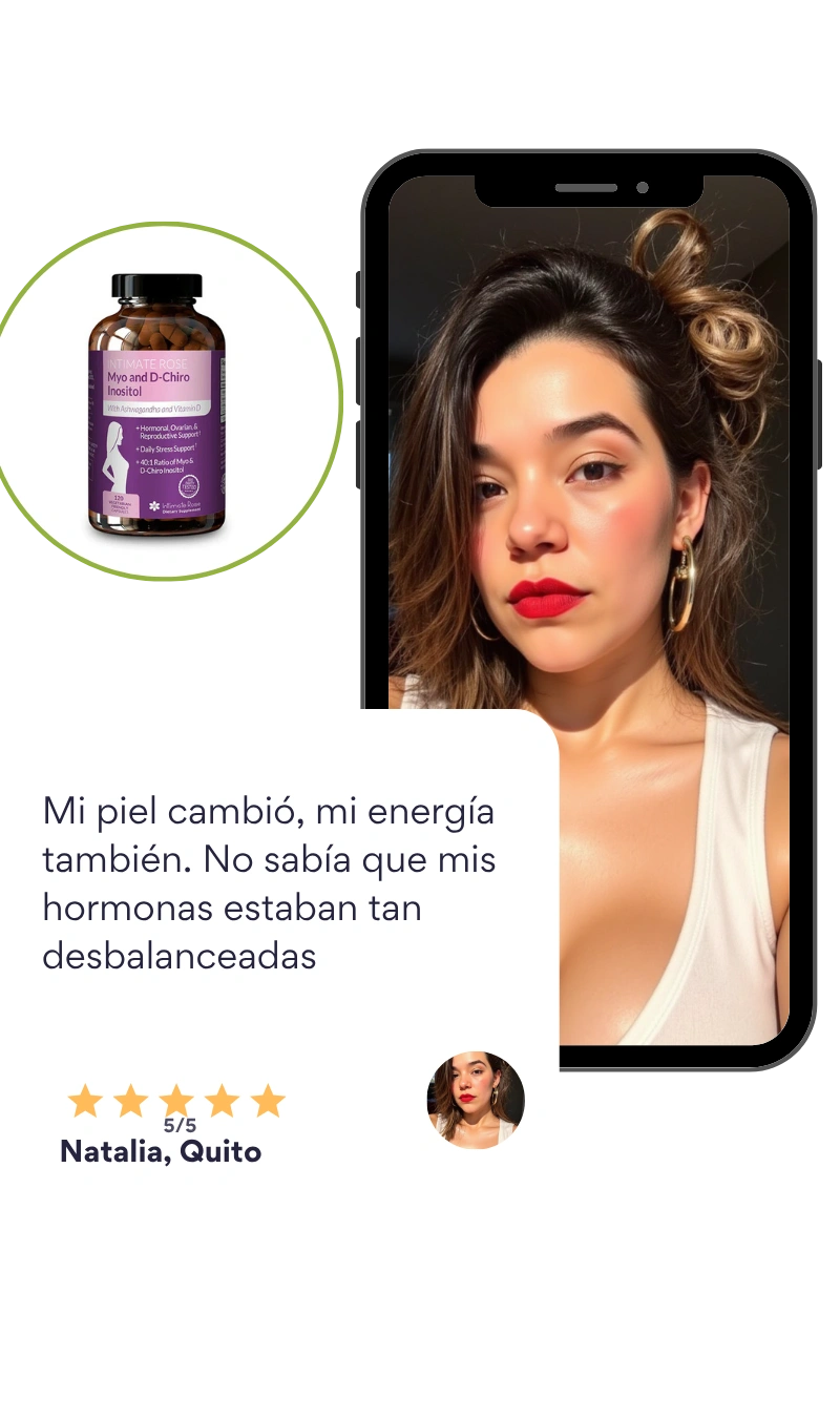 Usamos el ratio 40:1 exacto de Myo y D-Chiro Inositol, el mismo utilizado en estudios clínicos sobre PCOS y fertilidad femenina. A diferencia de otros productos genéricos, nuestra fórmula añade ashwagandha y vitamina D para mejorar aún más tu estado de ánimo y metabolismo.