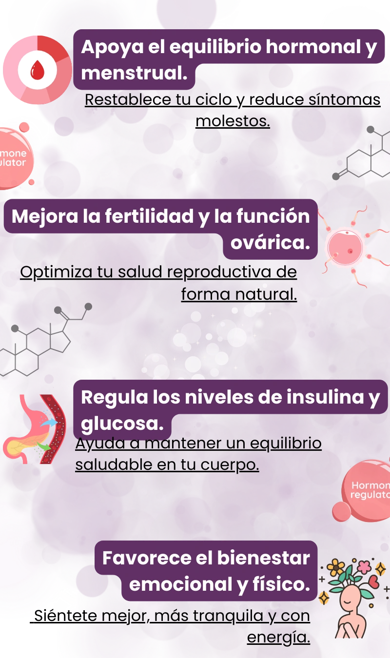 Los resultados pueden variar, pero muchas mujeres notan mejoras en su ciclo menstrual, energía o piel en 4 a 8 semanas. Para fertilidad y ovulación, lo ideal es usarlo al menos 3 meses continuos, ya que el cuerpo necesita tiempo para equilibrar sus hormonas de forma natural.